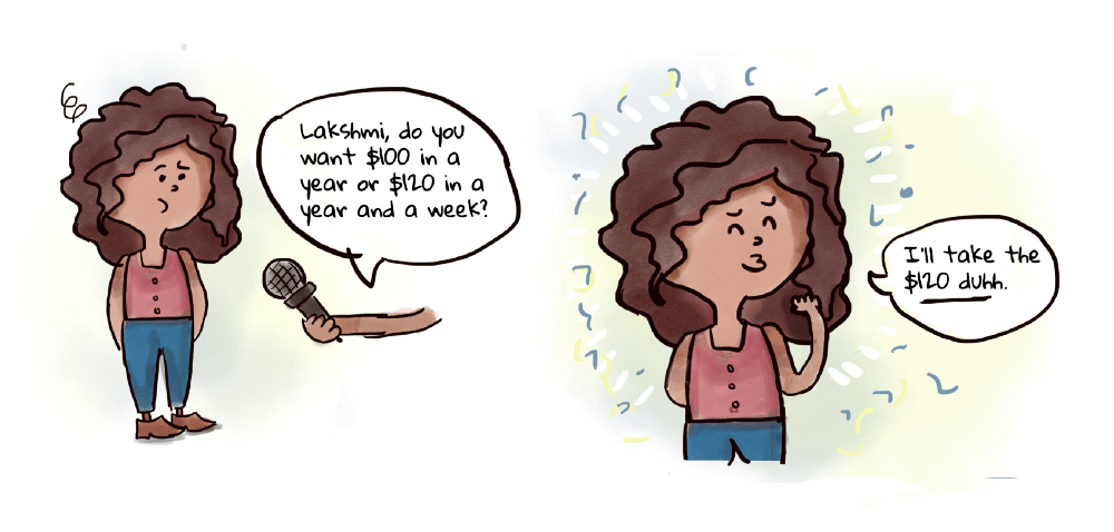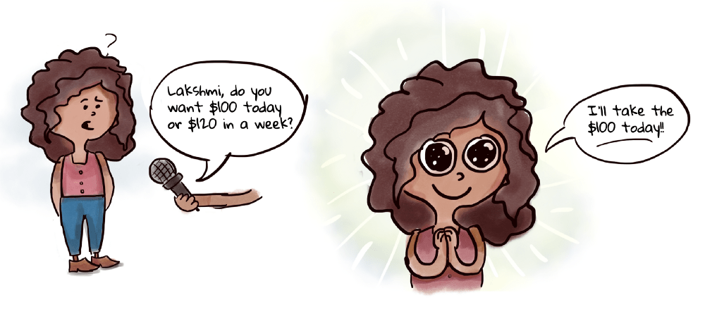Researchers ran a classic experiment that illustrates the phenomenon. Imagine you’re given 2 choices: get a $100 today or $120 in a week. Here’s how most people choose: