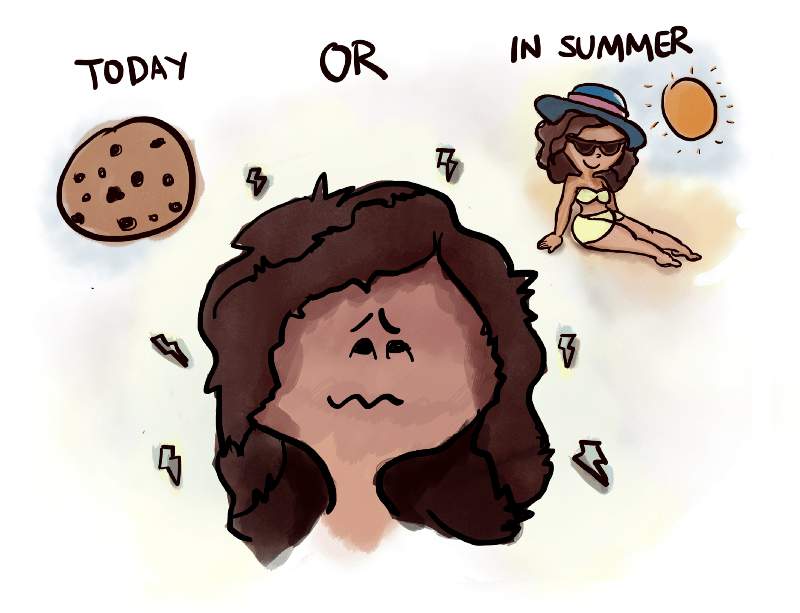 Unfortunately, the choices you have to make in everyday life are not as clear or easily comparable. Say you’re going on vacation in a few of months. How do you choose between enjoying a cookie right now versus looking good at the beach?